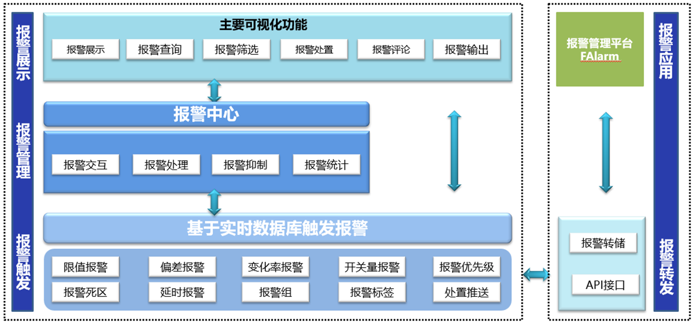 通過數(shù)據(jù)庫(kù)配置執(zhí)行、后臺(tái)處理、前端展示的模式確保報(bào)警觸發(fā)的實(shí)時(shí)性。報(bào)警多級(jí)別、多類型、多結(jié)構(gòu),以及多客戶端顯示/確認(rèn)的設(shè)計(jì)便于客戶高效處理和篩選報(bào)警信息。