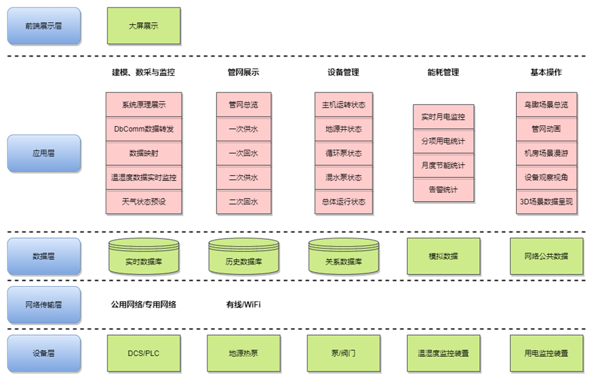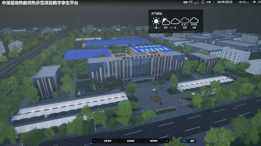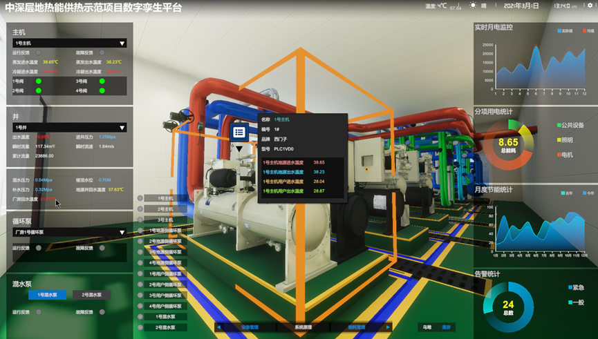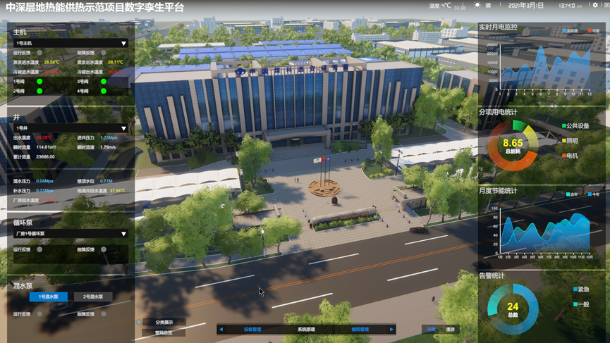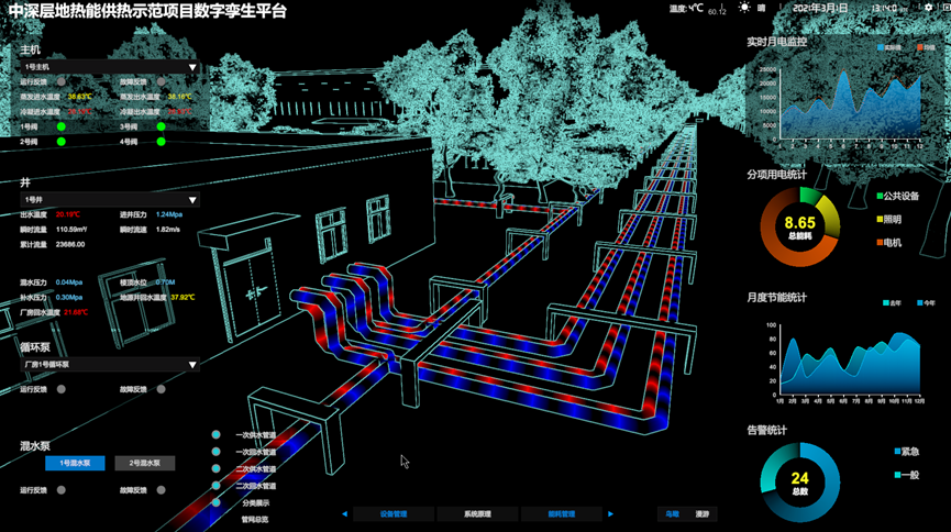 本軟件通過對中煤科工西安研究院地熱供暖泵房、主辦公樓及周邊輔助建筑物的供暖制冷需求搭建高精度1:1三維模型和工藝數學模型,通過三維可視化監控界面實現主要供暖、制冷區域的溫濕度監測,及泵房主要設備溫度、流量、壓力等運行參數監控;結合工藝數學模型仿真計算結果、提供運行控制參數合理化建議;整個系統具備歷史數據查詢、分析、能耗管理、仿真培訓、設備運行參數優化等功能,該項目的成功實施起到了推廣數字孿生平臺應用、促進兩化融合的先進示范效應。