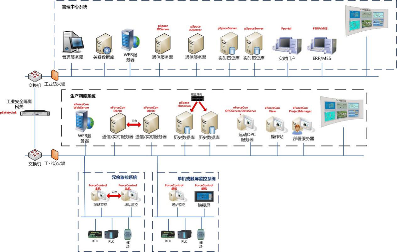 系統(tǒng)主要包括調(diào)生產(chǎn)現(xiàn)場監(jiān)控、生產(chǎn)調(diào)度系統(tǒng)、管理中心系統(tǒng)。生產(chǎn)現(xiàn)場監(jiān)控,需要配備場站監(jiān)控(冗余監(jiān)控系統(tǒng))和觸摸屏(單機或觸屏監(jiān)控系統(tǒng)),生產(chǎn)調(diào)度系統(tǒng)主要配備實時數(shù)據(jù)庫、歷史數(shù)據(jù)庫、遠動OPC服務(wù)器、操作員站及部署服務(wù)器等,管理中心系統(tǒng)主要配置企業(yè)級實時歷史數(shù)據(jù)庫和企業(yè)實時信息門戶;層級之間配備了隔離網(wǎng)關(guān)和防火墻等安全設(shè)備保證系統(tǒng)信息安全。