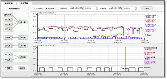 管理運(yùn)行主要包含站間管線監(jiān)測以及井場管線監(jiān)測,主要以實(shí)時與歷史曲線方式體現(xiàn)。 站間管網(wǎng)曲線重點(diǎn)對各站點(diǎn)對點(diǎn)集輸或插輸管線的流量、壓力實(shí)時監(jiān)測,井場管線重點(diǎn)以井場回壓實(shí)時監(jiān)測。