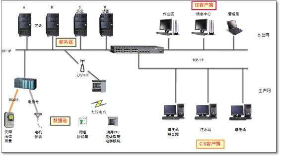 SCADA系統(tǒng)監(jiān)控中心以2臺冗余的服務(wù)器做為數(shù)據(jù)采集,由eForceCon歷史庫做為歷史數(shù)據(jù)備份服務(wù)器及WEB發(fā)布工作,至少配備2臺以上操作作員站(C/S客戶端)做為服務(wù)器的遠(yuǎn)程部署及工藝流程處理工作,并具有控制泵與抽油機(jī)等設(shè)備的最高優(yōu)先級。在監(jiān)控中心的其它計算機(jī)或辦公區(qū)域計算機(jī)可直接通過IE瀏覽器訪問SCADA系統(tǒng)工程,并可根據(jù)分配的不同權(quán)限等級完成具體的監(jiān)控工作。