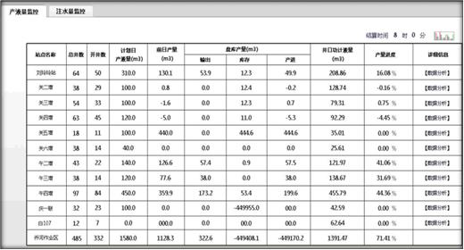 生產(chǎn)運(yùn)行主要包括產(chǎn)液量監(jiān)控與注水量監(jiān)控,產(chǎn)量液量監(jiān)控主要體現(xiàn)全區(qū)所有站的開井?dāng)?shù)、計劃產(chǎn)量、前日產(chǎn)量、當(dāng)日輸出、當(dāng)日庫存、當(dāng)日產(chǎn)進(jìn)量、功計產(chǎn)量、產(chǎn)量進(jìn)度數(shù)據(jù)。 油井產(chǎn)量分析界面重點(diǎn)體現(xiàn)增壓站所管轄井場各油井當(dāng)日產(chǎn)量、昨日產(chǎn)量、井場產(chǎn)量、較昨日差值、油井狀態(tài)、工況分析結(jié)果、功圖分析、原因分析。 注水量監(jiān)控主要體現(xiàn)昨目注水量、當(dāng)日注水量、折算配注量、以及配注差、配注進(jìn)度。水井產(chǎn)量分析主要體現(xiàn)各站閥組的分壓、管壓、日注水量、日配注量、瞬時流量、累積流量、水井配注。