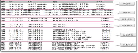 事件系統(tǒng)重點(diǎn)記錄整個SCADA系統(tǒng)的運(yùn)行情況,在服務(wù)端與客戶端所記錄的內(nèi)容方式有所不同,分別為冗余服務(wù)器日志、歷史服務(wù)器日志、客戶端操作日志。
