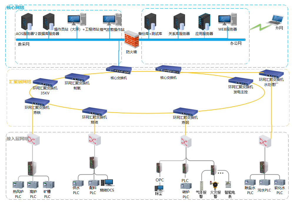 實現(xiàn)能源數(shù)采網(wǎng)絡(luò)的整體貫通建設(shè)獨立、安全、穩(wěn)定和可靠的能源數(shù)采通信網(wǎng)絡(luò),全面覆蓋公司各生產(chǎn)單位、各工藝設(shè)備,打通信息壁壘,同時進行環(huán)網(wǎng)的補全規(guī)劃建設(shè),使主干網(wǎng)絡(luò)星環(huán)相接,保證企業(yè)信息高速通道的穩(wěn)定、暢通。