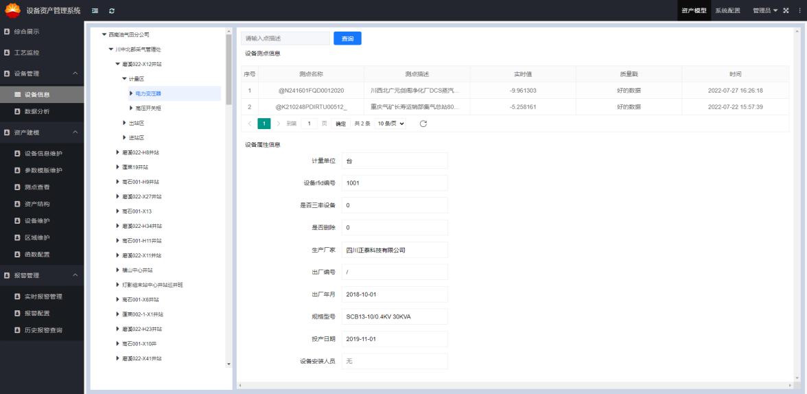 一樣是采用樹形結構展示,對當前的所有場站的設備進行分區管理,選擇到對應的二級或者三級單位后,可以查看到當前選擇單位的設備總數信息和設備的基本信息,如果選擇的是設備,右邊會出現設備的數據監測點和設備綁定的各種信息,簡潔直觀的發現當前設備是否存在問題。