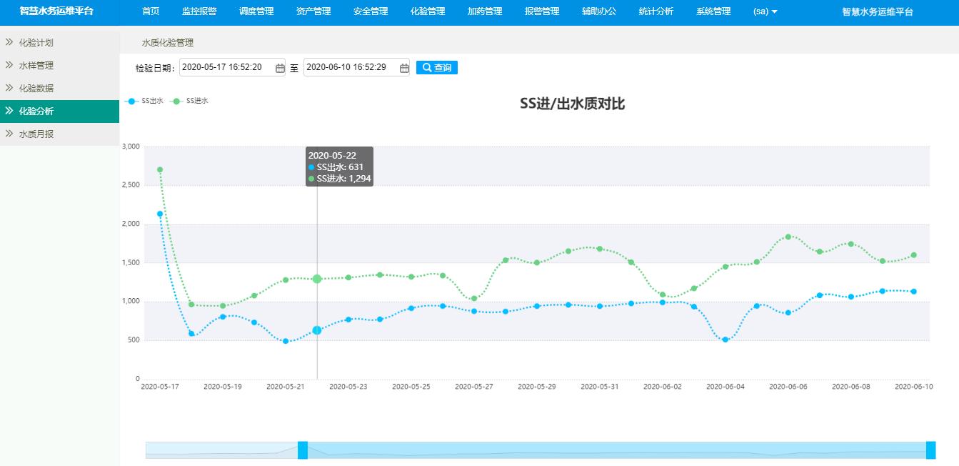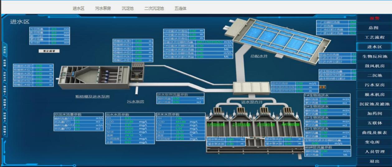 能夠通過BS瀏覽器方式顯示各類統計匯總信息,給企業的運行管理提供直觀、高效的運行監視圖,實現污水廠監視畫面集成。能夠集成污水廠SCADA、進出口處的主要數據(包括壓力、流量、液位、水質等)及其集中監視畫面。展示關鍵運行數據:包括出水數據,電耗數據,加藥數據,設備數據等; 監視畫面中設備區域可以和設備檔案之間建立鏈接,雙擊即可跳轉到對應設備臺帳信息,雙擊監視畫面中的測點,可以直接察看每個測點的歷史數據曲線。