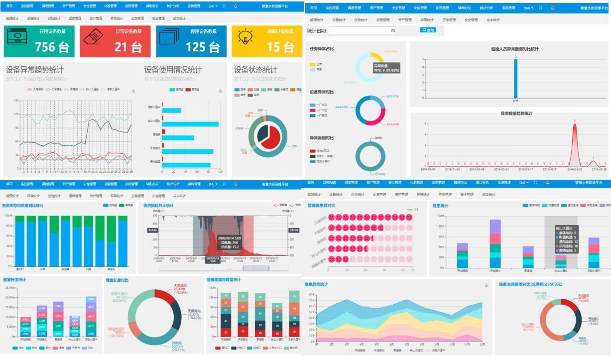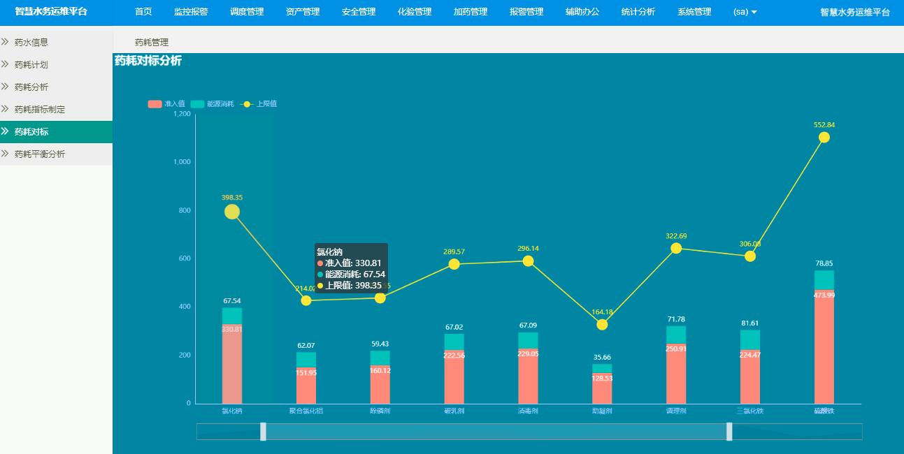 建立藥耗控制與分析系統,可根據采集的信息提前計算生產需要的碳源、PAC等藥劑的投加量,加藥前后指標變化趨勢,并進行加藥自動控制,并可分析出任意時間段內各單元的藥耗,生成日報、月報、年報。可實現對藥耗生產運行成本進行分析控制和藥劑管理。對用能分類分項進行同環比分析,以棒圖、餅圖、報表等形式展示,讓用戶更直觀、快速地了解藥耗信息。