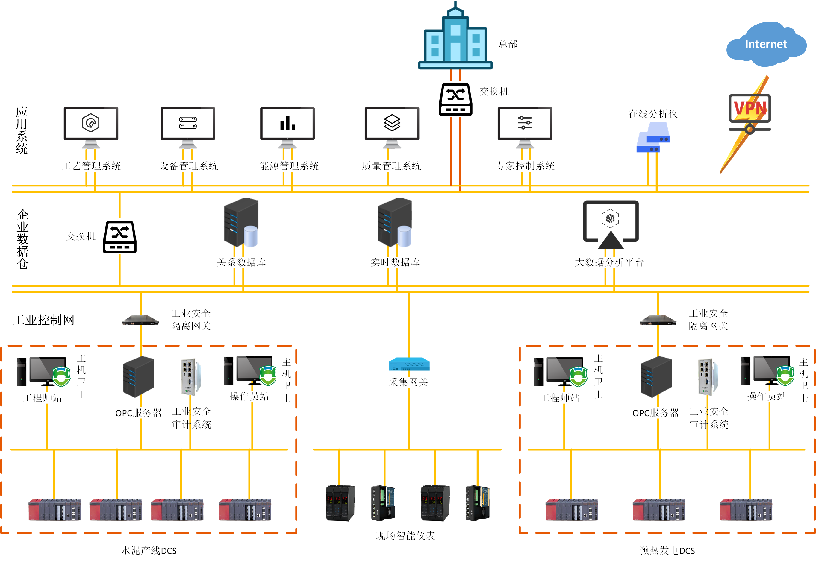 金隅水泥在運營中已經應用分布式控制系統(DCS)和信息管理系統(MIS),屬于工控自動化系統。因水泥企業的規模和產能不一,網絡建設情況也不同,不同情況存在分布式網絡結構、環網結構及虛擬化系統等。