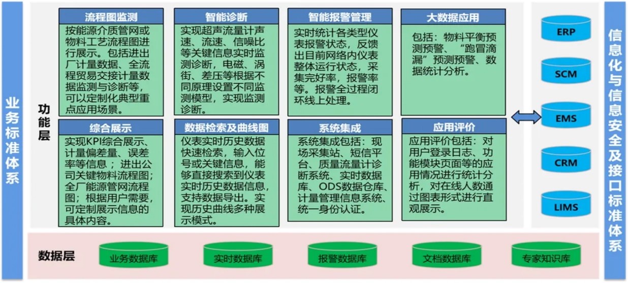 ? 結合大數據算法,實現計量KPI指標實時運算,公司級能源管網檢測率監測診斷,物料主輔數據實時比對分析等,為生產經營提供更加及時精準的計量數據。