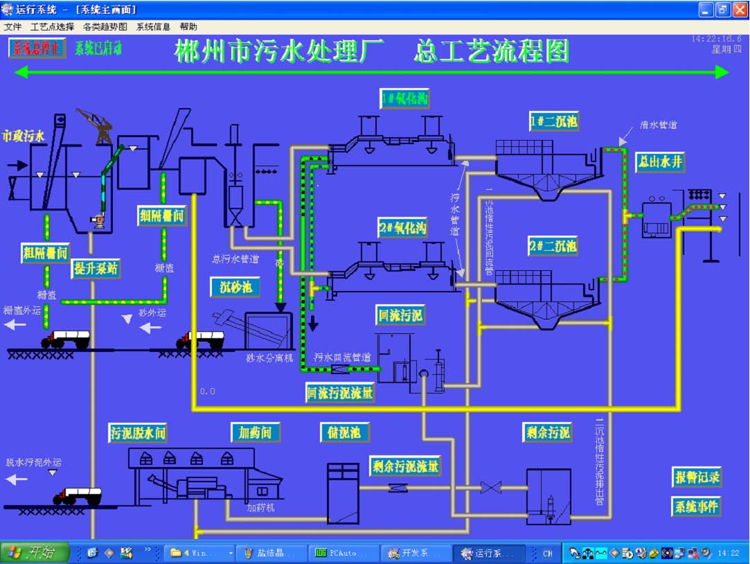該系統PLC選用Omron公司的CS1系列PLC,通過Control-Link總線和力控監控組態軟件進行數據交換。有兩套力控監控組態軟件參與監控系統,組成的系統建設有多幅實時監控畫面,包括系統總貌、提升泵站與除砂池、1#氧化溝、2#氧化溝、二沉池、泥路、加藥脫水間等,通過指示燈表明設備運行狀態,整個軟件界面呈樹狀排列,查閱、操作簡便。