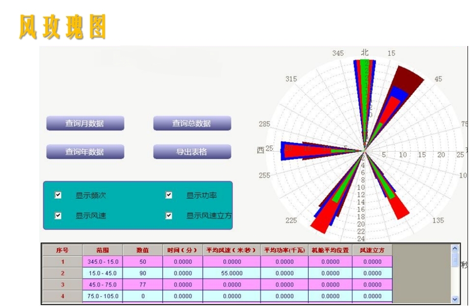 ② 系統顯示各臺機組的運行數據。如每臺機組的瞬時發電功率、累計發電量、發電小時數、風輪及電機的轉速和風速、風向等,將下位機的數據調入上位機并顯示,必要時還可以用曲線或圖表的形式直觀地顯示出來。