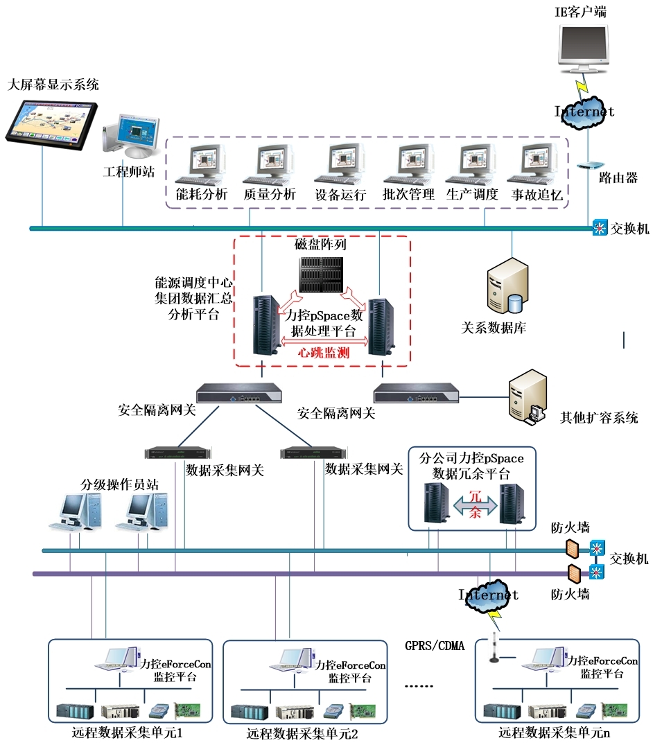 力控科技為企業(yè)EMS能源管理系統(tǒng)提供了綜合解決方案,典型能源系統(tǒng)架構(gòu)包括能源調(diào)度管理中心、通訊網(wǎng)絡(luò)、遠(yuǎn)程數(shù)據(jù)采集單元等三級(jí)物理結(jié)構(gòu),其中信息采集與防護(hù)特點(diǎn)如下: