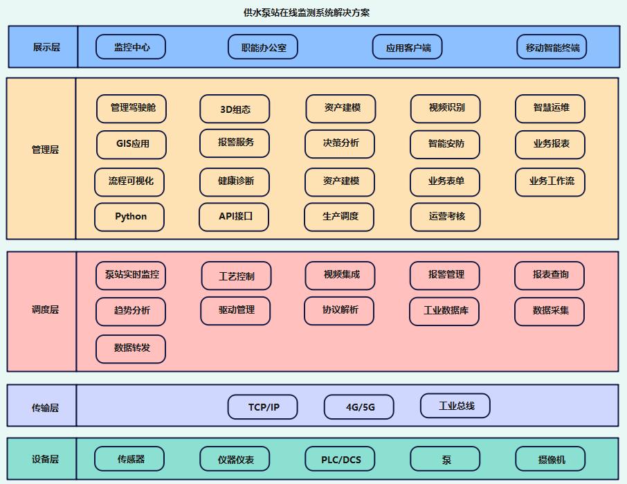 智慧供水泵站系統架構分為五層:設備層是供水泵站的基礎硬件部分;傳輸層承擔數據與指令的傳輸任務;調度層是整個供水泵站的智能中樞,它接收來自傳輸層的設備運行數據與供水需求信息,基于內置智能算法與調度模型進行綜合分析與運算;管理層為泵站管理人員提供全面的運營管理功能;展示層提供系統與用戶交互的界面,管理人員可一目了然地了解泵站運行全貌。
