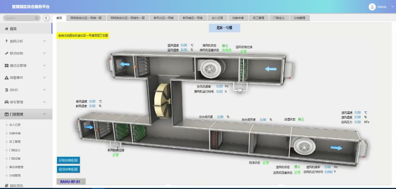新風及空調智能運行:在自動模式下,綜管平臺依據實時季節(jié)、天氣及溫度設定參數,向數據接口下發(fā)風閥、風機、加濕等設備的控制指令,實現設備智能化運行。