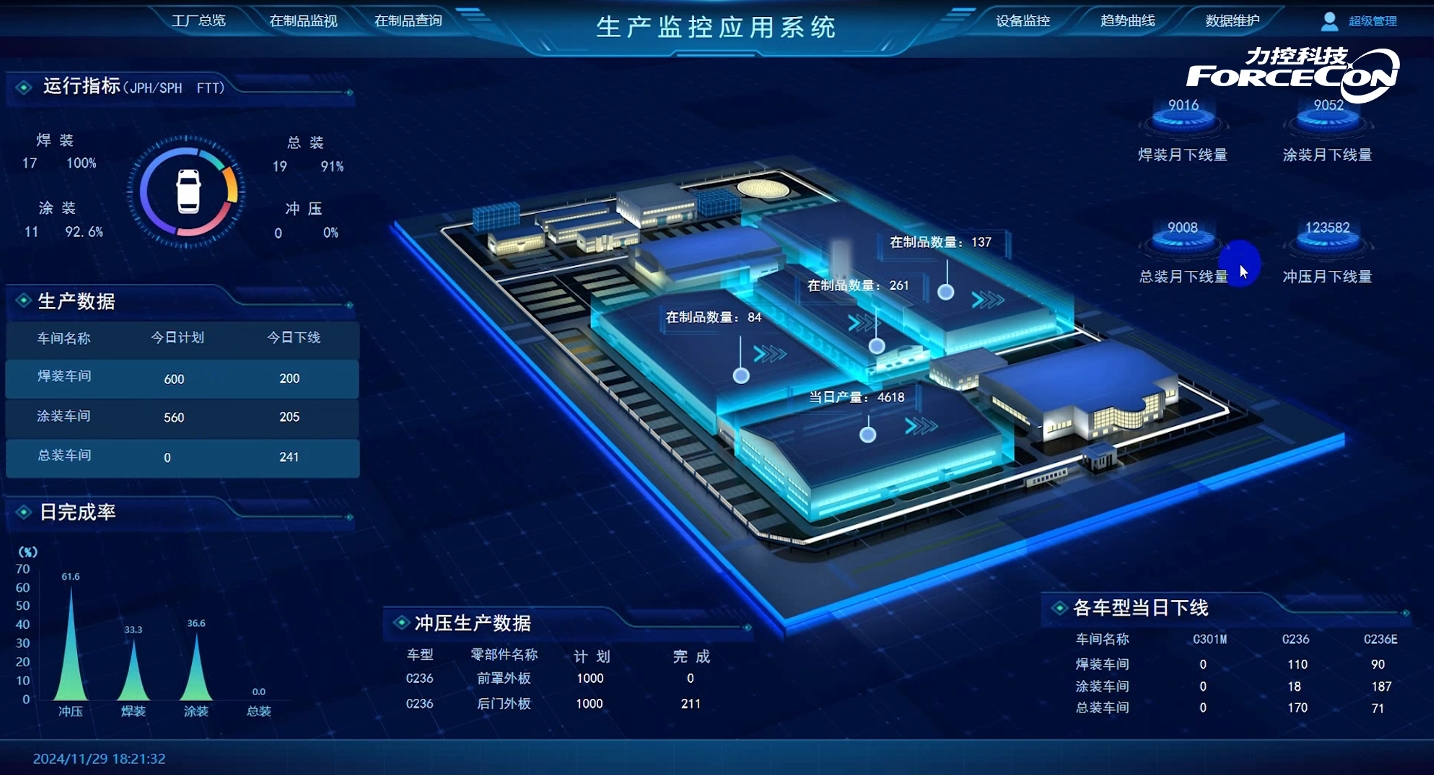 針對某車企數據孤島林立、網絡覆蓋不足、設備協同低效等問題,力控為其量身打造了汽車整車智能工廠生產過程實時監控系統,通過全場景可視化、智能預警、數據驅動優化等功能,助力車企實現生產全流程的透明化管控與高效協同。