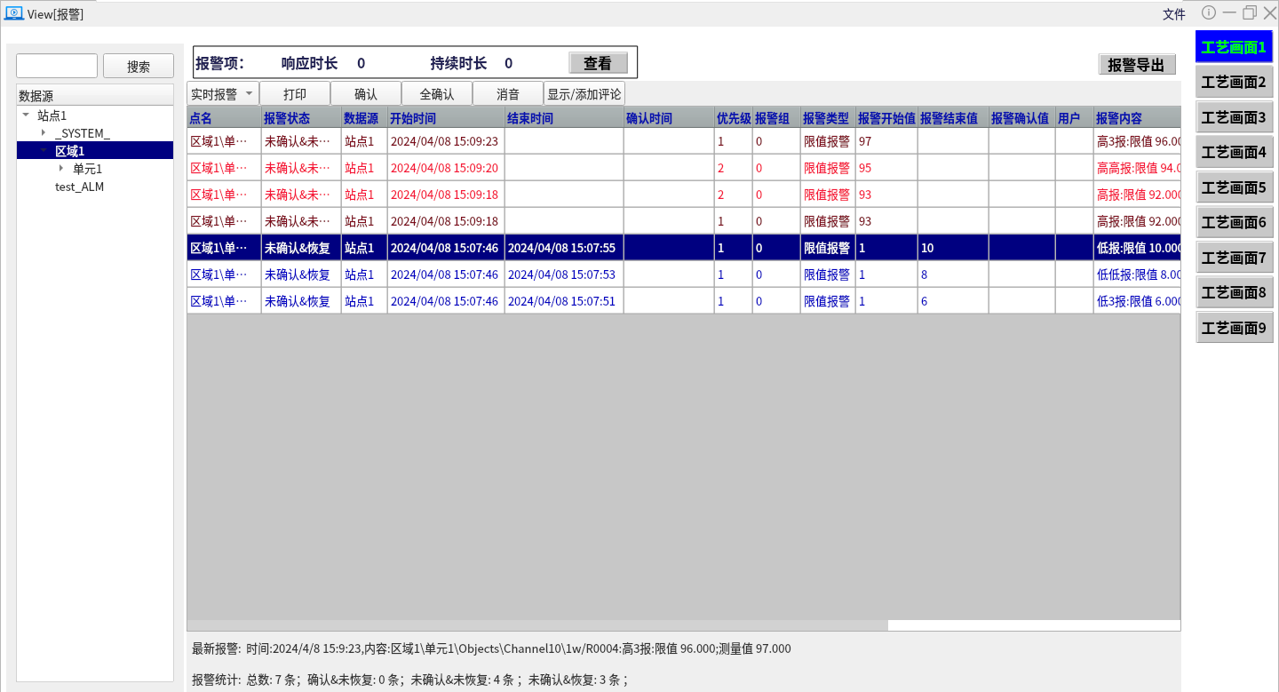 報警對應工藝畫面及設備位置的快速精準定位,報警發生時,直接定位到對應工藝畫面,或通過數據源樹定位至區域、車間或專業節點下做對應報警篩查。
