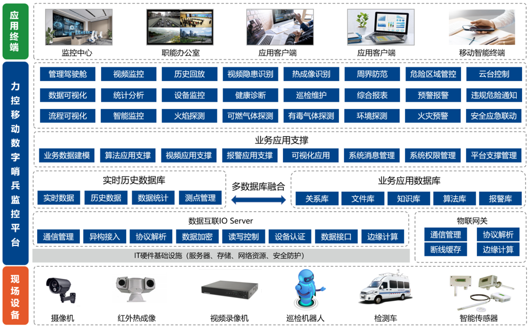 力控移動數(shù)字哨兵監(jiān)控平臺支持探測裝置、智能傳感器、視頻圖像、安防報(bào)警以及各類工業(yè)設(shè)備統(tǒng)一接入管理,實(shí)現(xiàn)各維度數(shù)據(jù)統(tǒng)一展示分析,并結(jié)合算法模型實(shí)現(xiàn)AI識別、危險(xiǎn)提醒、數(shù)據(jù)分析、預(yù)警等智能應(yīng)用, 提高現(xiàn)場安全防范、智能運(yùn)維能力,該平臺目前已廣泛應(yīng)用于石油、化工、礦山、樓宇、變配電、交通、環(huán)保等領(lǐng)域。
