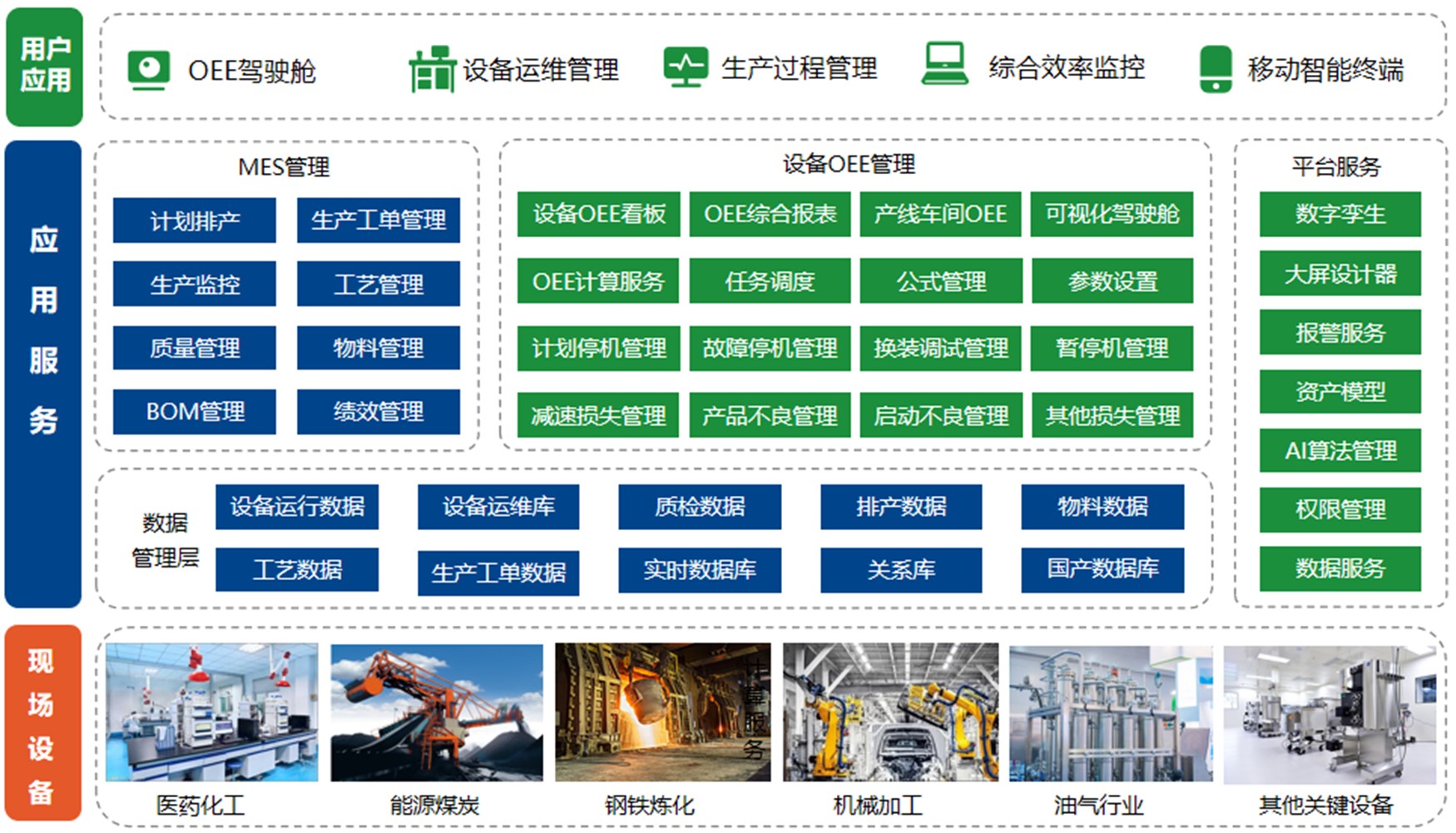 OEE計(jì)算服務(wù)能夠?qū)崿F(xiàn)可用性、性能和質(zhì)量指標(biāo)的綜合計(jì)算,形成覆蓋設(shè)備、生產(chǎn)線、車間等多層級(jí)的OEE綜合分析,運(yùn)用大屏可視化、報(bào)表和數(shù)字孿生等手段實(shí)現(xiàn)數(shù)據(jù)可視化展示。