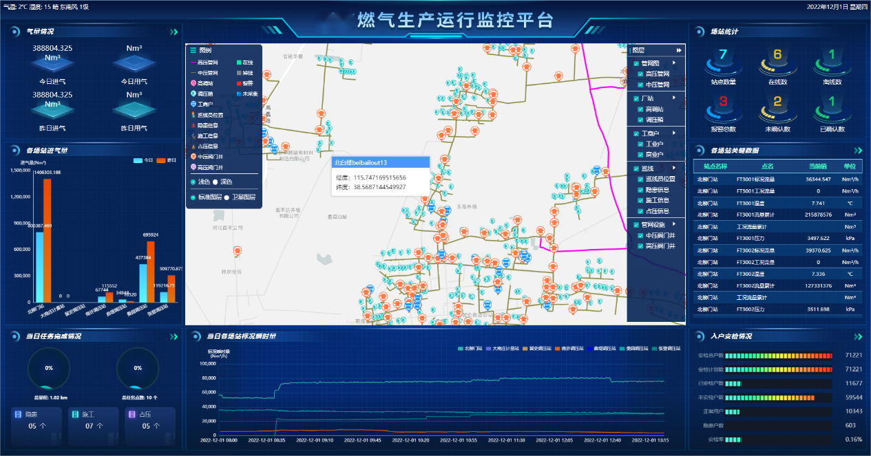 生產(chǎn)運行監(jiān)控主要借助SCADA系統(tǒng)將分布在管轄區(qū)域內(nèi)場站、閥室、調(diào)壓站、用戶、加氣站所采集的管網(wǎng)設(shè)備的運行參數(shù)匯集上來,從而掌握整個管網(wǎng)的運行情況,并對運行設(shè)備進行實時監(jiān)控。系統(tǒng)出入口采用GIS地圖和場站檢索組合方式,可通過地圖查看也可通過搜索進入該場站。