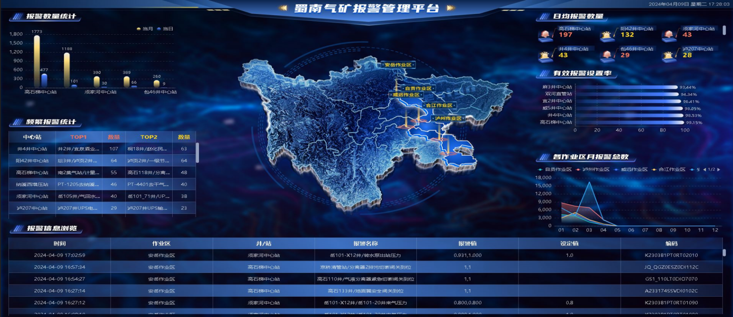 大屏展示聚合展示日均報警數量、報警數量統計、有效報警設置率、頻繁報警統計、各作業區月報警總數、報警信息瀏覽。